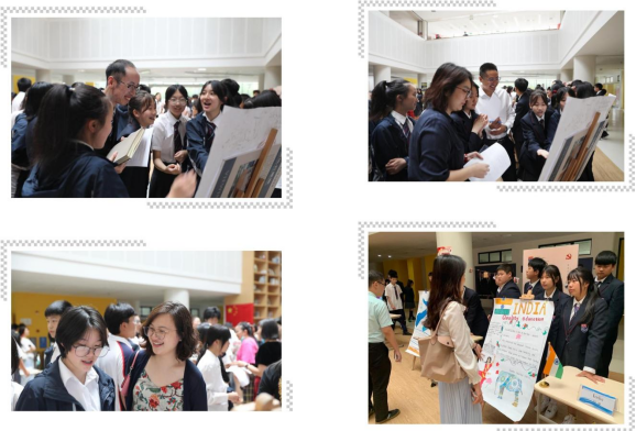在国家展示阶段,各国家代表队将精心绘制的国家形象海报展示在活动大厅,每个队的队员们都积极地、热情地、骄傲地向老师、家长展示着自己的海报设计。不仅仅是海报的生动与有趣,同学们还认真地用英文介绍着海报里的所画所写,评委老师们也听得认真,大厅里始终回响着各国代表队交流的声音,场面热火朝天。说到有趣之处,评委老师们还会用英文了解海报制作背后的故事和好奇选择展示的原因。