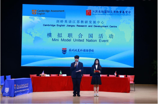 为开阔学生国际化视野,提高青年人对国际议题的理解与判断,推动素质教育的落实,剑桥英语江苏教研发展中心和苏州北美外国语学校联合举办模拟联合国活动。该活动对是联合国大会和其他多边机构的仿真学术模拟。在活动中,学生们扮演不同国家或政治实体的外交代表,参与国际热点问题的讨论与交流。